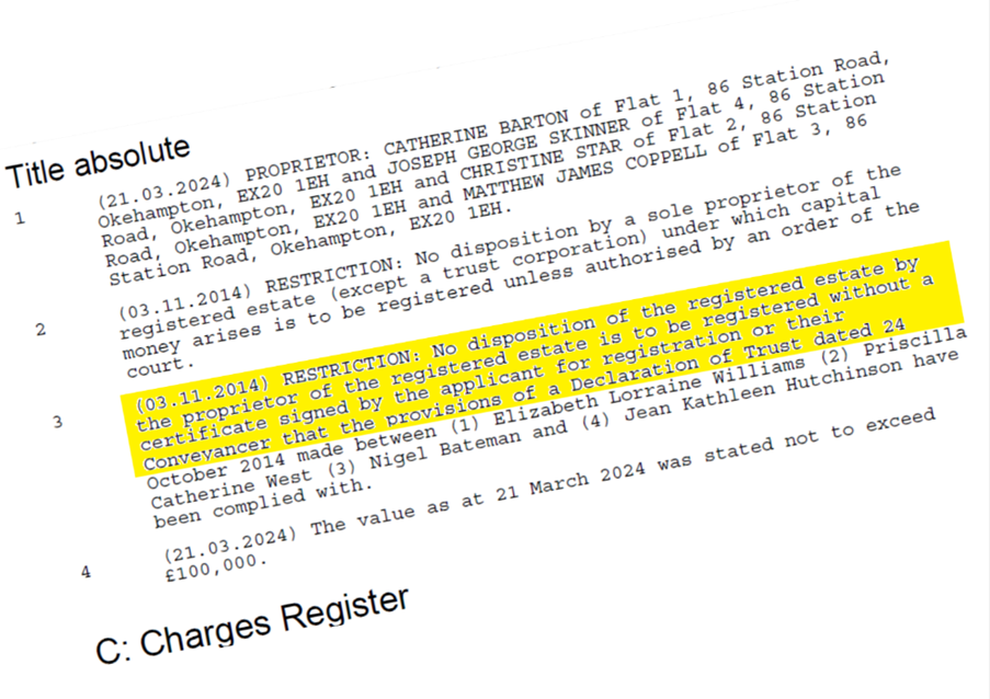 Property titles registered with HM Land Registry often contain restrictions (such as the one illustrated in the picture) that HM Land Registry should not permit changes to the register without a conveyancer’s certificate.